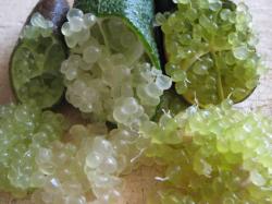 Spooned gently onto oyster and other seafood dishes, they not only add the appearance of beautiful miniature pearls, they add a sweet lime flavor that can only be described as absolutely delicious. Desserts are made more interesting and flavorful as easily as pairing Fingerlimes with vanilla ice cream.