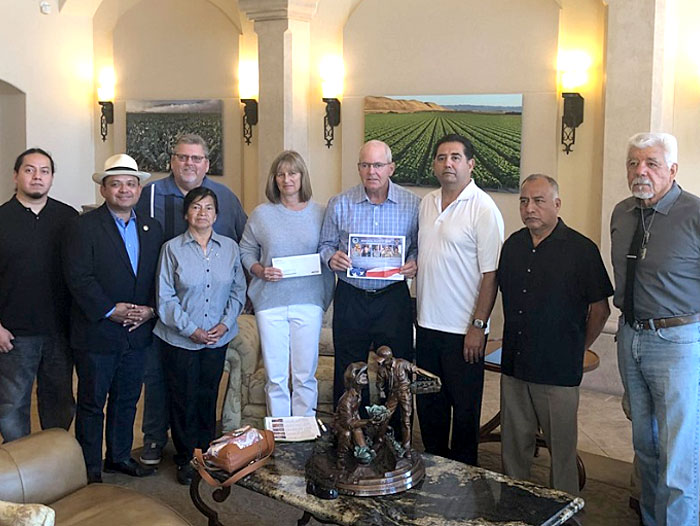 John D’Arrigo and his wife Sandy D’Arrigo presented a check to support the Fallen Heroes Highway Memorial Project to Monterey County Supervisor Luis Alejo. The photo below was taken during the check presentation at the headquarters of D’Arrigo California in Salinas, CA. From left to right the individuals in the photo are Fidel Sanchez (social worker and supporter of Fallen Heroes Project), Luis Alejo (Monterey County Supervisor), Margarita Sanchez (homemaker and mother of U.S. Army Sgt. Javier Sanchez), Keven Peterson (Salinas Pawn Shop Owner and supporter of Fallen Heroes Project), Sandy D’Arrigo (wife of John D’Arrigo), John D’Arrigo (D’Arrigo California Pres./CEO, Chairman of the Board), Ricardo Cerros Sr. (US Army retired/Behavior Intervention Specialist and father of U.S. Army Ranger and Specialist Ricardo Cerros, Jr.), Javier Sanchez Sr. (Eligibility Specialist for County Social Services and father of U.S. Army Sgt. Javier Sanchez), and Phil Orozco (US Army retired and supporter of Fallen Heroes Project).