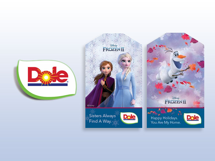 • DOLE® Pineapple Holiday Gift Tags Inspired by Disney’s Frozen 2  (Launches Nov. 25, 2019) – Dole makes healthy gift-giving easy with an exclusive set of DOLE® Pineapple gift tags celebrating Disney’s Frozen 2. Pineapple fans can download one of six collectible gift tags featuring Elsa, Anna, Olaf, Kristoff and Sven from www.dole.com/Disney and then add a bow and their own personalized message to create a unique gift for Christmas, the holiday season and a healthy New Year.