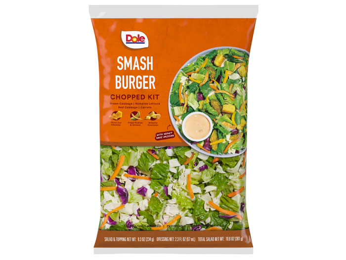 - DOLE® Chopped Smash Burger Salad Kit: A bold, crave-worthy twist on a classic American favorite, this kit transforms the flavors of a burger into a fresh, satisfying experience. Featuring DOLE® Romaine Lettuce, Green and Red Cabbage, Carrots, thick-cut cheddar cheese, crispy onions, brioche croutons and fried pickles, this salad is topped with a rich, creamy secret sauce dressing that brings all the flavor indulgence of a smash burger without the bun or patty.