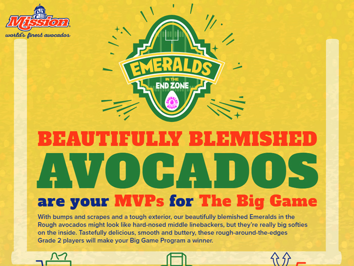 Mission Produce, the world’s leading producer, distributor, and marketer of fresh Hass avocados, is gearing up for The Big Game by announcing its Emeralds in the End Zone retail campaign,a strategic promotion that offers retailers and shoppers a winning game day value. Emeralds in the Rough are two or three-pound bags of grade 2, beautifully-blemished avocados the perfect ingredient for that game day party spread.