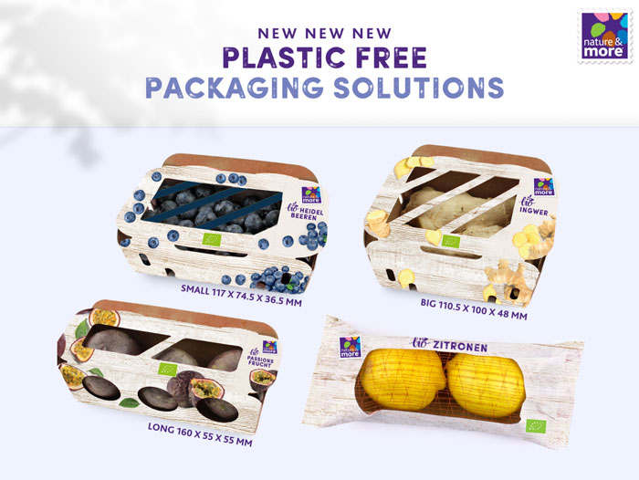 Other plastic-free options: paper/cardboard carry trays with handles, date boxes, physalis trays and viscose nets for citrus fruits.