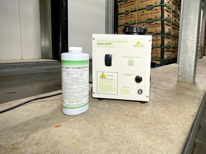 The process of producing ethylene in ripening rooms was invented and patented by Catalytic Generators in 1973.  The system consists of a catalytic-type generator that converts a liquid concentrate, called Ethy-Gen® II, into safe levels of ethylene, which is a natural plant hormone produced by many fruits, including bananas, tomatoes, avocados, mangos, and pears. With a strategic distribution network, Catalytic Generators offers its customers timely service and delivery across the globe.