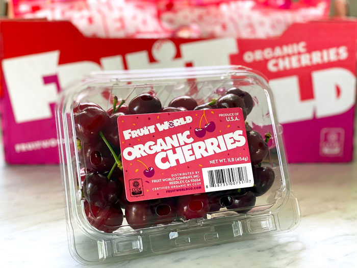Unaffected by the late April rains, Fruit World’s Coral, Lynn and Tioga cherries are at peak flavor. Packed at Podesta Packing in Linden, CA, a new, state-of-the-art optical sorter ensures that only the best of the best cherries make it into the retail pack. “The fruit looks spectacular. We are really happy with this year’s crop, and it looks great in our fun and bright packaging,” said Richter. Fruit World’s organic cherry season continues through the end of May.