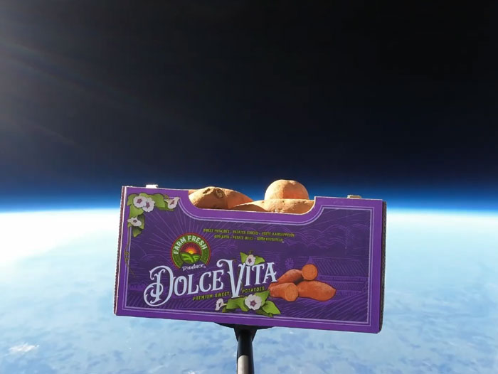 World Records are constantly being rewritten for the heaviest sweet potatoes. But Dolce Vita entered the history books as the first sweet potato brand to travel to space, following its successful intergalactic trip. The box of Dolce Vita sweet potatoes was transported via a meteorology/weather balloon. The 72 second YouTube video captioned, “Our Sweet Potatoes are Out of This World”, shows Dolce Vita’s sweet cosmic ride, which took 2 hours and 25 minutes to get to the edge of space and 1 hour and 40 minutes to make its way back to earth.