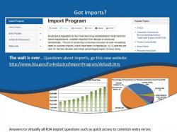 There are answers to virtually all FDA import questions such as quick access to common entry errors, and there is contact information to reach real people locally and in headquarters. The Imports site is part of the overall FDA website, FDA.GOV. Enclosed is the actual link. We encourage all to bookmark it.