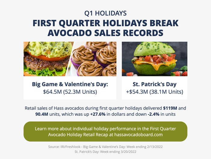 MISSION VIEJO, CA – Sales of Hass avocados kicked off the new year with four-year record highs through first quarter key holidays including the Big Game, Valentine’s Day, and St. Patrick’s Day. The Hass Avocado Board’s (HAB) recently published retail recap indicated increased dollar sales during the key holidays that drove a combined 90.4 million units and $119 million in retail sales. As the only independent avocado organization that equips the entire industry for success, HAB produces quarterly reports about national holiday retail sales performance. The holiday reports provide insightful sales information for retailers, category managers, and industry leaders as they plan holiday promotions and look for opportunities to grow avocado sales in the upcoming year.