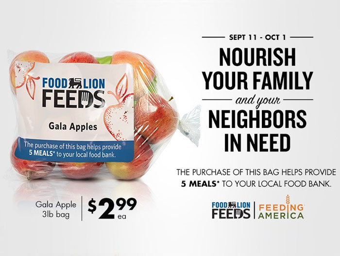 With the sale of each bag through Oct. 1, or while supplies last, Food Lion Feeds will donate five meals* to local food banks in partnership with Feeding America®. The number of meals donated to each food bank will be based on the number of participating bagged apples sold in each food bank’s service area. The bags will maintain an MVP sale price of $2.99 throughout the campaign.