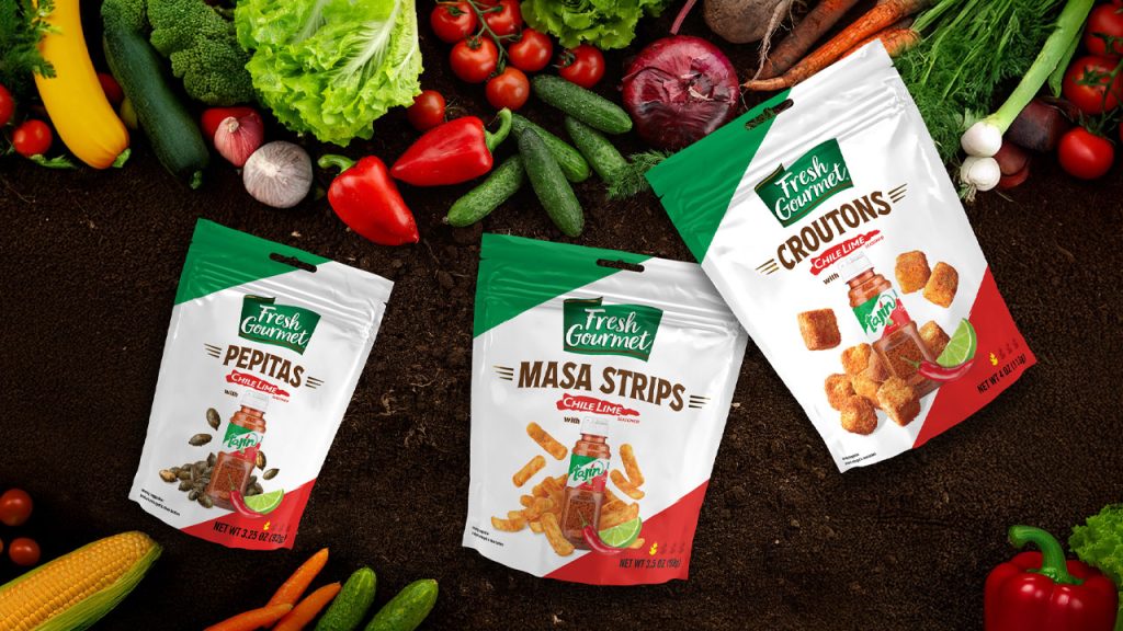 “Fresh Gourmet is always looking for simple ways to make our customer’s life more convenient, and more delicious,” said Senior Marketing Manager, Samantha McCaul. “With our new Tajín lineup of Chile Lime Seasoned Croutons, Pepitas & Masa Strips, it’s now easier than ever to take veggie-forward dishes up a notch, or two, in flavor.”