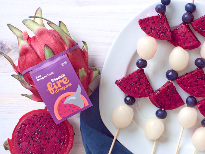 The striking appearance of the fruit make this a must for attention-grabbing displays. “We recommend merchandising Fire Dragons™ alongside young coconuts (on ice) and blueberries to create a seasonally relevant color break for the July 4th holiday,” says Alex Berkley, director of sales at Frieda’s Specialty Produce. “I plan to use Fire Dragons™, Rambas™ Rambutan and blueberries to make these deliciously fun red, white & blue kabobs for my holiday weekend BBQ.”