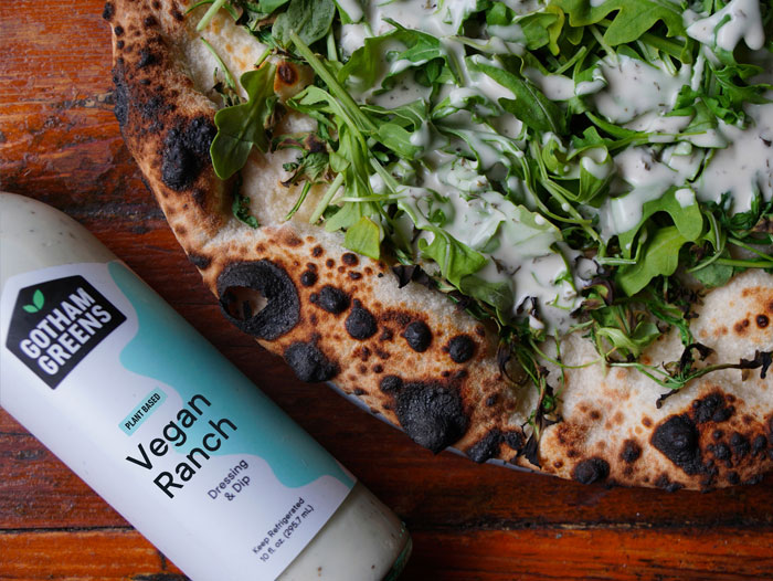 - Paulie Gee’s Gotham Greenpointer: An homage to Gotham Greens’ first rooftop greenhouse located in Greenpoint, Brooklyn, this white wood-fired pizza is topped with baby arugula and extra virgin olive oil and drizzled with Gotham Greens Vegan Ranch dressing.