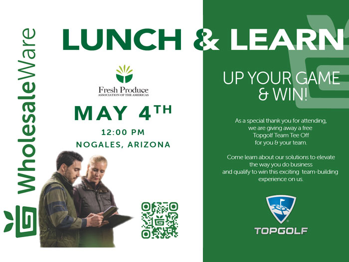 Tucson, AZ – WholesaleWare, your leading provider of software solutions for wholesalers in the perishable and fresh industry, is excited to announce an exclusive Lunch and Learn event at the Fresh Produce Association of the Americas (FPAA) on May 4th at 12 pm, in Nogales, Arizona. The event, hosted by WholesaleWare’s Bryan Barsness, will showcase the company’s cutting-edge offerings, demonstrating the functionality, features, and ease of use that have made it a top choice among fresh produce and perishable customers, industry-wide.