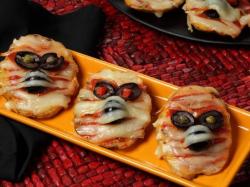 - Spoon equal amounts of the pizza sauce over each, (about 2 teaspoon per slice). Sprinkle evenly with the pepperoni. Place an olive near the center of each potato slice to form a "nose." Pull off thin strips of the cheese and lay across the potato to form the "bandages.” (Note: the cheese may hang over the edges of the potato slightly. They will form to the shape of the potato when melted.) Cut the remaining olives in half lengthwise and place two halves above the "nose" to form the "eye sockets.” Place capers and bell pepper cubes in the center of each olive half to form the "eyeballs."