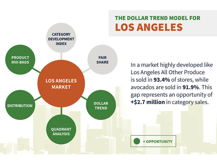 However, there are still opportunities for growth. When reviewing each of the six dimensions, the Los Angeles market shows opportunities in the dollar trend, distribution, and quadrant analysis models for the total category and bagged avocados.