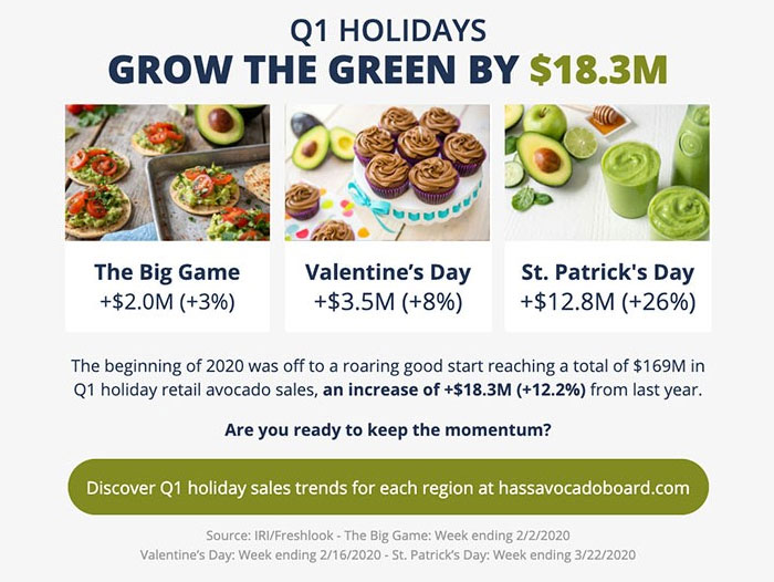 | The three key Q1 holidays, including the Big Game, Valentine’s Day and St. Patrick’s Day, reached a total of $169 million in retail sales, an increase of +$18.3 million from last year. Learn more by reading the 2020 Avocado Holiday Retail Recap. |