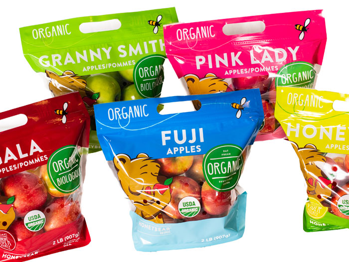 Honeybear has experienced great success with its two-pound Honey Cubbie pouch as the market leading Honeycrisp package. As an extension of this success, Cubbie pouches will be available in three-pound packages for Gala, Fuji, Granny Smith, Pink Lady and Pazazz™ varieties. In response to the growing consumer appetite for these high graphic packages, Honeybear is also updating its organic pouch program which compliments the continued expansion of all its organic offerings. Consumers will now be able to choose from their favorite varieties (Honeycrisp, Gala, Fuji, Pink Lady and Granny Smith) grown organically and available in two-pound pouches.