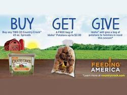 - GIVE: Idaho Potato Commission will give a bag of potatoes to Feeding America for each coupon redeemed, up to 32,000 5-pound bags total, and Country Crock® is donating $15,000 to the 35-year-old nationwide network of food banks, the leading domestic hunger-relief charity in the United States.