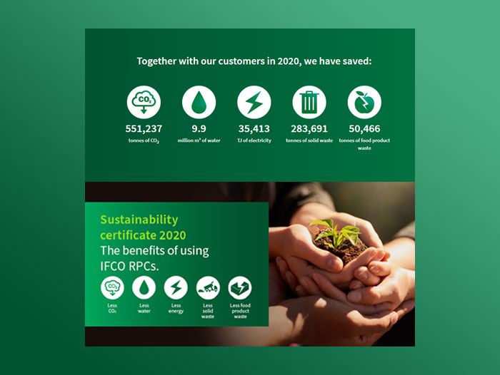 As the use of RPCs makes a meaningful contribution to environmental protection, IFCO shares these achievements with its customers by presenting the Sustainability Certificate to them since 2018 for their efforts in the year before. Each retailer and grower customer will receive a certificate highlighting the amount of carbon dioxide, water, energy, solid waste, and food waste avoided by utilizing IFCO RPCs in its supply chain. These savings are based on IFCO’s energy and resource savings estimate1 2 3.