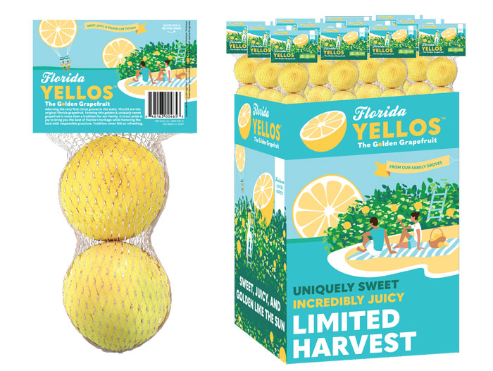 Available this winter season in a convenient grab-and-go 2-pack with bright imagery depicted in an array of yellows, blues, and greens, YELLOS’ fun and cheerful packaging encourages consumers to take home a bag. The front of the YELLOS header bag transports the consumer to IMG Citrus’ Florida family groves, where citrus is handpicked and farmed with the utmost respect for the heritage of the land through responsible agricultural practices. The back of the YELLOS header bag illustrates an escape to a tropical Florida paradise with people parasailing by grapefruit, while others relax on a sandy shore with a refreshing YELLOS grapefruit in hand. The packaging also promotes YELLOS’ “sweet and juicy” flavor profile along with its high vitamin C content and low-calorie count. A peek inside the YELLOS header also shares nutritional content, various ways to eat YELLOS, and a recipe for a Sparkling Golden Grapefruit Cocktail, perfect for transporting consumers to fun under the Florida sun. YELLOS 2-pack bags will also be featured in colorful POP displays located on retail store floors.