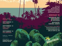 Riverside, C.A. — Index Fresh will host its 20th Avocado Grower Seminar Series this September with experts addressing integrated pest management in avocados and biological control agents. The seminars will be held in Venturan on 9/11, San Luis Obispo on 9/12, and Fallbrook on 9/13.