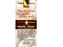In order to help foodservice professionals understand the tremendous value and calculate the cost of an individual Idaho potato, the IPC is offering a simple-to-use, slide tool designed to determine the price per serving. This Cost Per Each Serving Calculator is small (3 x 8), made out of durable, coated cardboard and a cinch to use! For example, if you order an 80-count carton and the produce supplier charges your operation $20.00 per carton, you can easily calculate that the net cost per potato is about 25 cents.