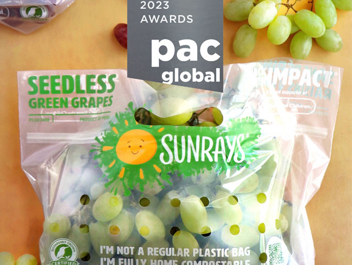 Tarrytown, NY – Jac. Vandenberg’s SUNRAYS® brand was celebrated for excellence in package innovation and sustainable design at the prestigious PAC Global Awards Wednesday night. The company’s branding and marketing team took home the Award of Distinction for its SUNRAYS home compostable grape bags in what marked a record-breaking year of submissions to the competition. This was the first entry Jac. Vandenberg has made to the PAC Global Awards.