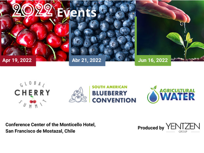 Santiago, Chile – This year, three international events – the South American Blueberry Convention, Agricultural Water Summit and Global Cherry Summit – will be held in person in Chile. All events are organized by Yentzen Group and will be held at the Hotel Sun Monticello Conference Center.