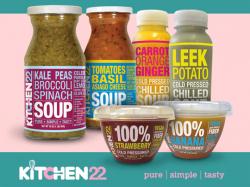Kitchen22 will be presenting at the Featured Product Showcase and at booth 1611 at the United Fresh Show in Chicago June 20-22, and is happy to announce its new line of cold HPP (High Pressure Processing) soups and fruit cups. This is in addition to their original line of soups in glass bottles which was launched at the PMA last year.