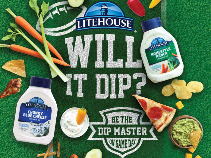 SANDPOINT, IDAHO  – Litehouse, Inc., a 100% employee-owned company and the No. 1 Refrigerated Salad Dressing (RSD) brand in the U.S.1, is launching a national campaign encouraging football fans to be the Dip Master on game day with Litehouse dressings and dips. With 37% of fans most looking forward to the eating and drinking that takes place during the big game2, the Will it Dip? campaign encourages consumers to pair Litehouse dressings and dips with their game day favorites or discover unexpected and unique pairings.