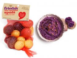 Star Spangled Spuds: Grab shoppers’ attention with this mix of Yukon gold, purple, and red potatoes in a 2-pound bag with Frieda’s new bold and brightly colored label.