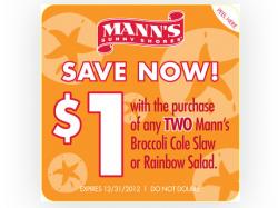 More than 200,000 IRCs will be applied to packages of Mann's Broccoli Cole Slaw and the new Rainbow Salad™ blend, starting June 14. Consumers will save $1 with the purchase of any two (2) of these items (U.S. only).