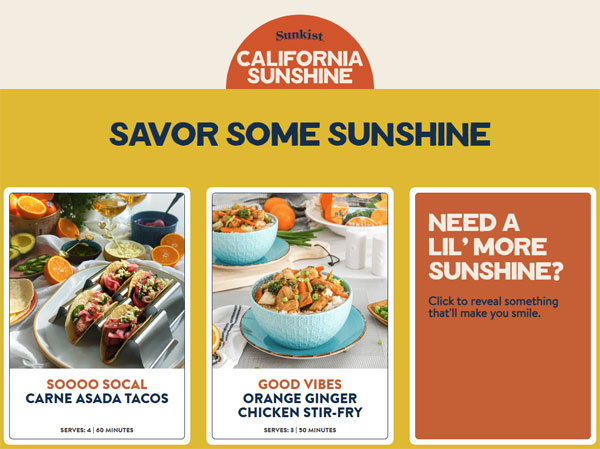 Sunkist invites consumers to explore personalized citrus-based recipes via its interactive tool at sunkist.com/calisunshine/ to further inspire citrus consumption. Users receive custom citrus-infused recipe ideas by selecting their preferred citrus varietal and meal type, driving both engagement and purchase intent.