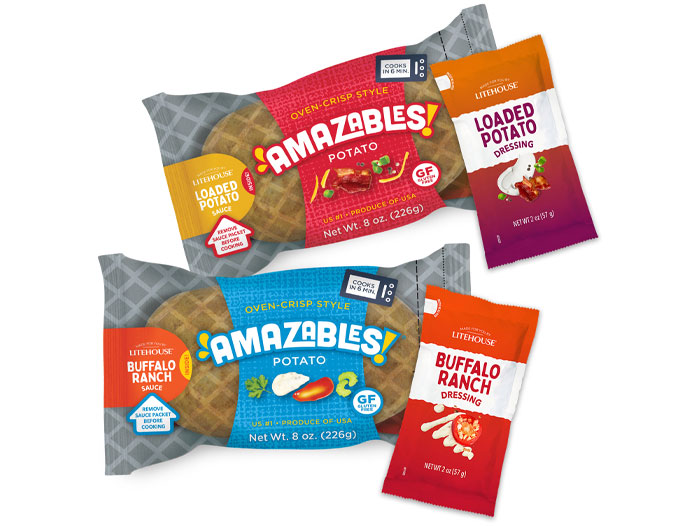 Launched in March, Amazables! is an oven crispy-skin style microwavable U.S. No.1 grade Russet potato available with two custom Litehouse® sauces created to maximize the taste of a Russet potato with complimentary flavors, including Loaded Potato sauce and Buffalo Ranch sauce. Amazables! potatoes are wrapped in an innovative film with Krisp Film technology that shrinks around the potato in the microwave and cooks in only six minutes. The #1 recyclable film safely remains cool to the touch after microwaving while keeping the potato inside hot.