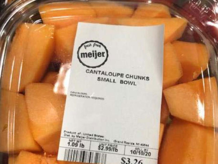 The recalled whole cantaloupe would have a sticker label stating Kandy Brand from Eagle Produce, LLC. If there is no sticker label to identify it, then it should be considered part of the recall. In addition, Meijer may have used cantaloupe ingredients that originated from Eagle Produce, LLC in the store made products. The following packaged products are in clear plastic containers under the Meijer brand label include: