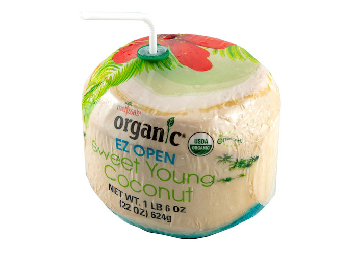 Los Angeles, California – Melissa’s Produce announces a new year-round supply of fresh and convenient, self-standing Sweet Young Coconuts from Thailand. Enjoy refreshing and nutritious coconut water directly from the coconut itself with no fuss! Just pull, press and peel, so opening requires no additional tools! Then use the convenient straw included in the packaging for a quick out of hand thirst quencher; coconut water can also be added as sweetener or flavoring to other drinks, baked goods and dessert dishes.