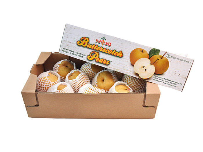 Los Angeles, California – Currently right now at the peak of the season Melissa’s Butterscotch Pears from South Korea are now found into produce departments across the country. These crisp, sweet, delicious, large sized Asian pears are considered the premium variety. Not only are they special from how they are grown, but how attractive they look to how wonderful their flavor is. Extreme care is taken while growing these pears; offering the cleanest and blemish-free fruit. In a very detailed and labor-intensive process, these pears are carefully hand-wrapped while still on the trees with a protective paper cover to protect them from the elements. The wrapping process protects the fruit from wind damage, rain, sunburn and other natural causes of blemishes and scars.