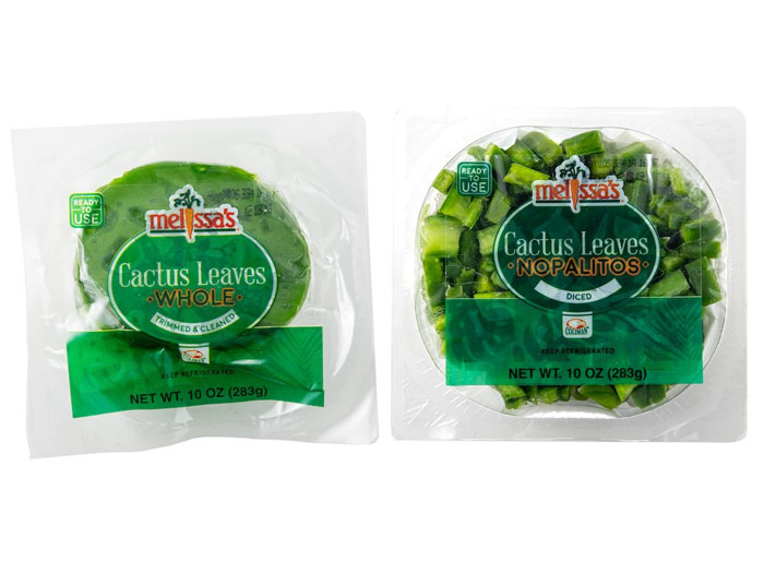 Melissa’s introduces Nopalitos in two ready-to-cook forms: cleaned and uniformly diced, and the whole leaf, void of spines. Both convenient packages eliminate the tedium and waste of prepping this staple of Mexican cuisine at home. Nopalitos are most often served at breakfast mixed with eggs, but is also a tasty ingredient when added to salads and soups.