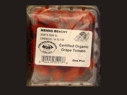 The grape tomatoes are packaged in square-shaped clear plastic clamshell containers labeled as Menno Beachy Certified Organic Grape Tomato, UPC number 044419310176, with a net weight of one pint. There are no lot numbers or expiration dates on the clamshell label. The clamshell packages are distributed in cases that are printed with a lot number. The case lot numbers affected by the recall are MB725GT3, MB725GT8, and MB725GT0.