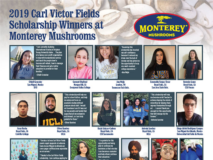 The Monterey Mushrooms scholarship program began in 1992. It was renamed the Carl Victor Fields Scholarship Program in 2004 to honor the company’s past vice president of marketing who was passionate about the importance of young people achieving their potential. Since inception 2,217 grants have been awarded for a total of more than $3 million.