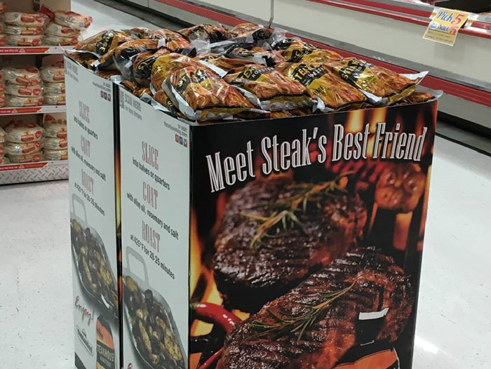 For its popular Steakhouse Roasters, MountainKing produced a display sleeve featuring two large steaks simmering over an open fire.  Other high-impact sleeves include imagery of freshly whipped mashed potatoes for its Gold varieties; a fresh seafood dish for MountainKing’s B-Reds and Baby Reds; and a boiling pot of fresh crawfish for its Crawfish B-Reds.