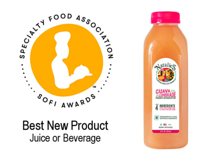 FORT PIERCE, FL – Natalie’s Orchid Island Juice Company announced today that its Guava Lemonade has won Best New Beverage in the 50th annual Specialty Food Association’s (SFA) sofi™ Awards. Each year, the associations’ sofi Awards honor the year’s the best products and specialty food innovations. Products are judged on taste, including flavor, appearance, texture and aroma, ingredient quality and innovation. Natalie’s Guava Lemonade competed with 2,000 entries across 53 product categories. The anonymous tastings were held by judges at the Food Innovation Center at Rutgers University.