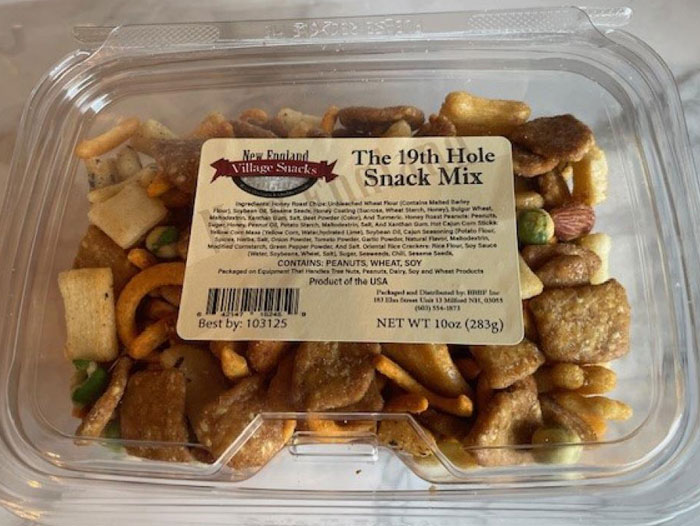 Consumers who have purchased the 5 -ounce or 10 -ounce packages of “19th Hole Snack Mix” are urged to return them to the place of purchase for a full refund. Consumers with any questions or concerns may contact New England Village Foods at 1.603.554.1873 (M-F 7AM to 4PM Eastern).