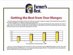 Using information from EMEX (Mexico Mango Growers Assn.) as well as the USDA, U.C. Davis, and the National Mango Board, along with its own proprietary research, the company plans on releasing “quick & easy” guides that are no more than one sheet, front and back. The first one, to be downloadable from its retailer blog site www.farmersbestinfo.wordpress.com as well as in print from via its merchandisers and sales staff, reviews seasonal availability and proper ripening temperature charts.