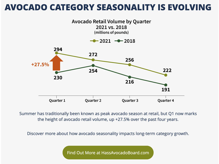 Summer has traditionally been considered the peak period for avocado sales. However, a new study by the Hass Avocado Board (HAB) determined that has changed. The Avocado Seasonality Drivers study reveals that the first quarter is the new peak for avocado retail sales and offers actions and opportunities to grow retail sales of avocados throughout the year. The industry can attend an upcoming webinar to take advantage of these findings and learn more.