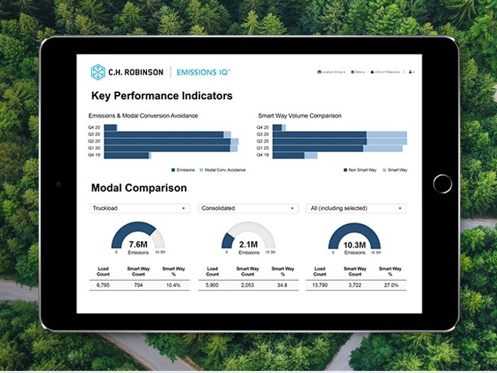Emissions IQ™, the latest innovation from C.H. Robinson’s tech incubator Robinson Labs, is a tool that automatically calculates emissions and provides an easy visualization of a shipper’s carbon output. Emissions analysis across all transportation modes is available from C.H. Robinson now, and all modes will be available within the self-serve tool once ocean and air are added later this year. Accredited to use the Global Logistics Emissions Counsel (GLEC) framework, Emissions IQ™  gives shippers data that’s trusted and universally accepted.