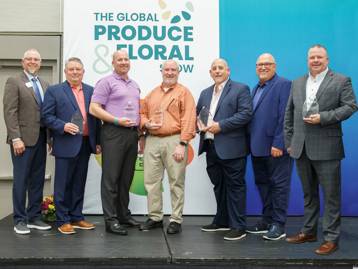 Photo caption: The 2022 winners of the IFPA Retail Merchant Innovation Awards represent the best of the best in produce retailing. They are (l-r): IFPA’s Joe Watson, Barry Paul of Shaw’s Supermarkets, Jim Gaylord of Wegman’s Food Markets, Brian Penfield of Sendik’s, Vic Savanello of Spartan-Nash, Chuck Sinks of Sage Fruit (award sponsor), and Jeff Mallory of Hy-Vee.