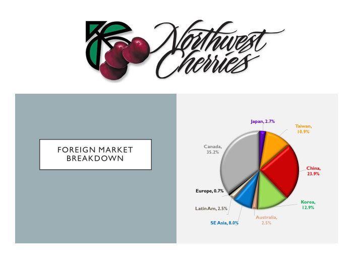In a normal year, the Northwest Cherry growers will ship to 30 or more countries and run promotional programs in 17 markets. For a total crop, the growers have been averaging 23 million 20 lb. equivalent boxes over the past five years. Exports have remained in the 7 to 8 million box range during this time.