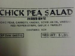 Consumers who have purchased Chick Pea Salad with EXP Date 04/07/10 should return it to the place of purchase for a full refund. Consumers with any questions may contact the company at (718) 765-0082, Monday Friday from 9 am -4 pm EDT.