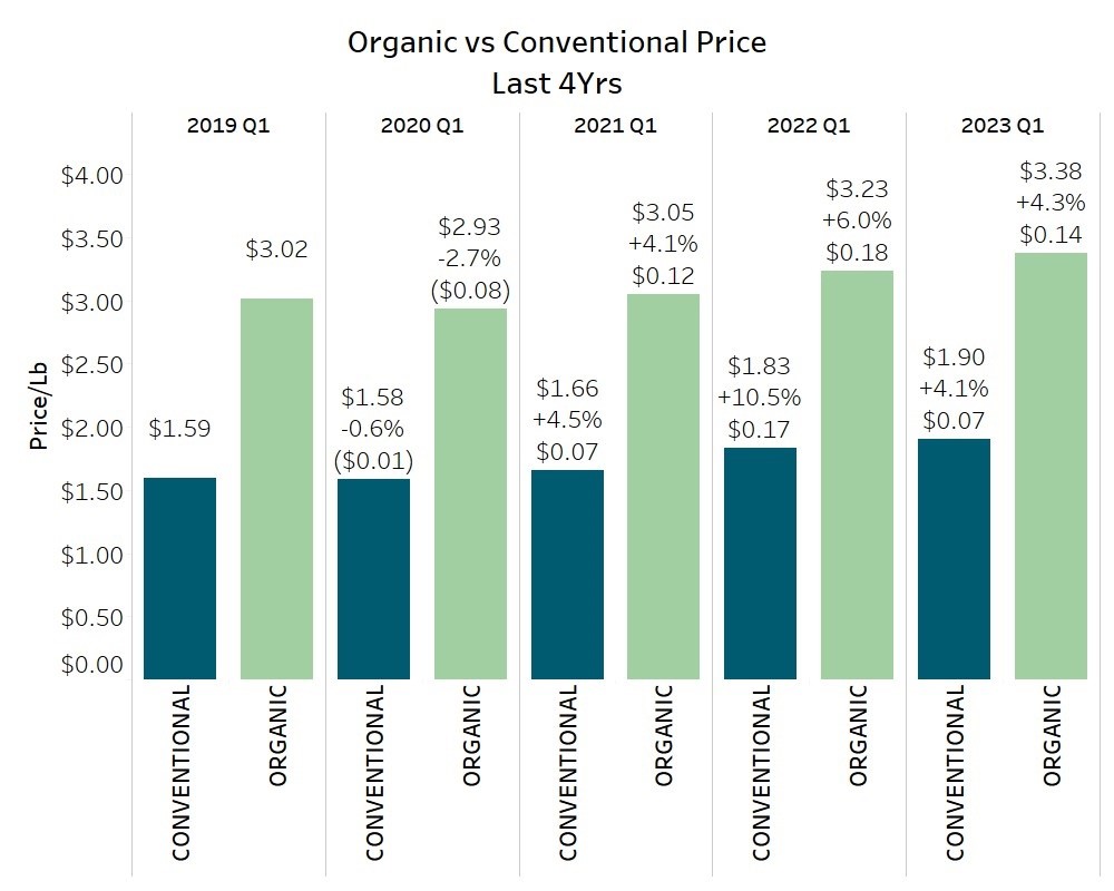 “In an inflationary period, we see this standard of growth for dollars and decline for volume repeated for most organic and conventional items. When we look at pricing, conventional produce average price per pound grew by 4.3 percent compared to the first quarter of 2022, while organic produce average price per pound rose by 4 percent,” said Tom Barnes, CEO of Category Partners. “With rising prices, we may be seeing more selective organic shopping from consumers as they substitute conventional items for higher-priced organic items.”