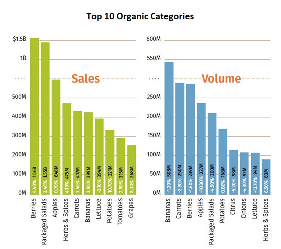While total organic produce sales increased by 3% and volume decreased by −3.7% year over year, the performance of the top 20 categories was quite variable as inflation and other pressures created a dynamic market environment.